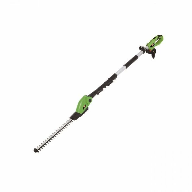 Hilka 18V Cordless Pole Hedge Trimmer: 46cm dual-action blades mounted on an 8 foot adjustable pole perfect for clipping hard to reach hedges and shrubs. Adjustable head makes switching from cutting the top of a hedge to the sides easy. Rapid telescopic system achieves tool-free assembly and adjustment. Cordless feature allows easy maneuverability and eliminates hazards such as cutting cords. Lithium-ion technology allows longer storage of charge.