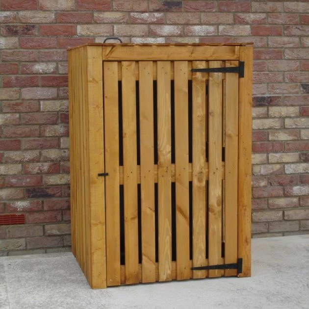 Shire 3 x 3 Wheelie Bin Store: The 3 x 3 Wheelie Bin Store by Shire is an attractive and practical storage solution to keep your wheelie bin out of sight and will prevent it from falling over in bad weather. The Bin Store is constructed from 12mm square board cladding with a slatted structure and features a hinged door to allow you to get the bin out and a hinged roof for easy access when filling the bin. The Shire 3 x 3 Bin is made with Quality Approved timber and has a dip treated finish in a golden brown finish.
