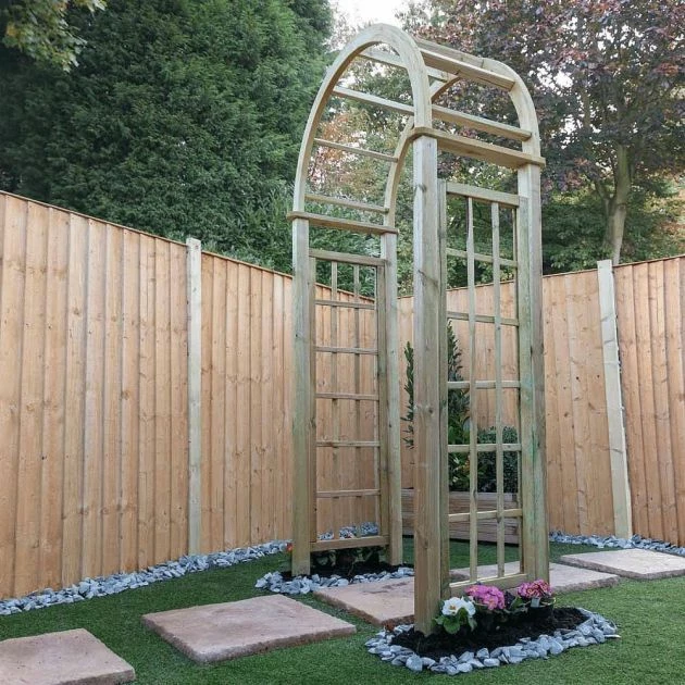 Mercia – Curved Arch: The Mercia Curved Arch, made with pressure treated timber, is the perfect addition to your garden. The Mercia Curved Arch‚Äö√Ñ√¥s elegant and timeless design will look great in any style of garden or patio. Thanks to the side trellises It will look equally lovely once covered in climbing plants and especially roses. If you are looking for the perfect entry or endpoint to your garden, look no further than the gorgeous Mercia Curved Arch.
