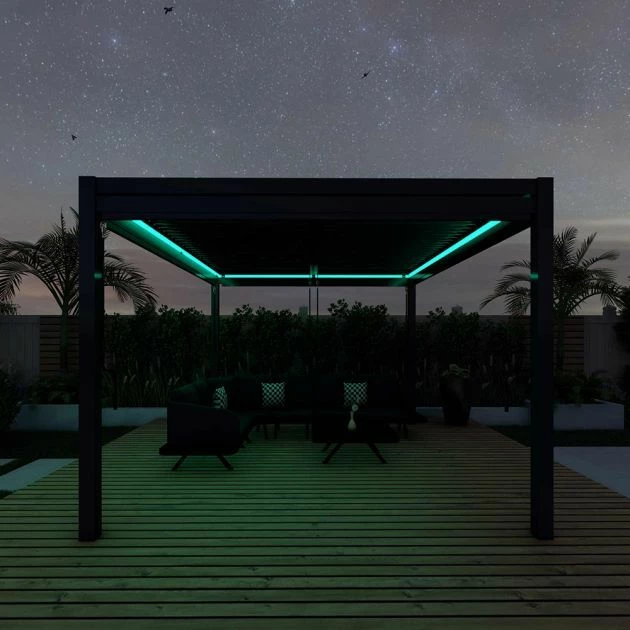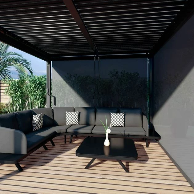 Made from high-quality aluminium, this pergola guarantees a solid and easy to maintain construction. The UV-protected aluminium protects your family from harmful rays, while ensuring that your pergola is resistant to fading. This 100% weather-resistant pergola is perfect for long-term use, ensuring that your outdoor garden remains beautiful and functional all year round. The tilting louvres are also convenient as they can be opened or closed depending on your preference, giving you the ability to create a sheltered space or an open area in your garden. With this pergola in your outdoor garden, you can sit back and enjoy the beauty of your surroundings. Inclement weather is no problem with its sophisticated drainage system, which efficiently disperses any rainwater on its roof. Plus, adjustable Textiline drop sides bring an added layer of protection from the sun and wind, shielding you from any unwanted elements. It’s the perfect balance of form and function, providing a comfortable outdoor living space throughout the year. Explore what the Maze Pergola has to offer and transform your outdoor space today.