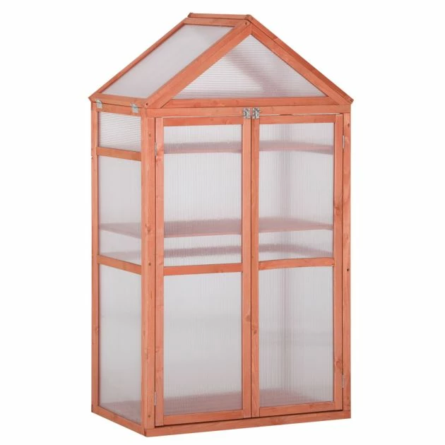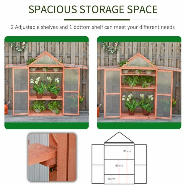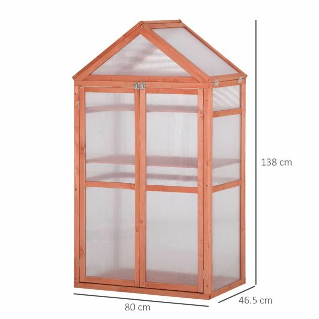 | Product Specification | Apex Mini Greenhouse with Shelf Natural 1m Specification: Colour: Orange Material: Fir Wood, PC Board Overall Dimension: 80L x 46.5W x 138H cm Single Roof Size: 56.5L x 46.5W cm Single Door Size: 35W x 97.5H cm Shelf Size: 72.8L x 42W cm Adjustable Height: 30cm, 60cm, 90cm Weight Capacity: 20kg(per shelf) |