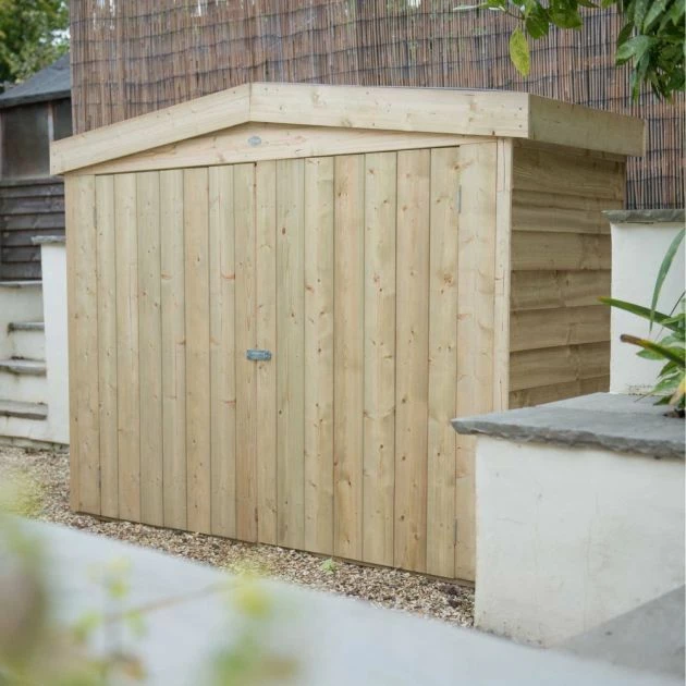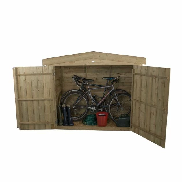 Forest Garden Pressure Treated Overlap Apex Large Outdoor Store: The Forest Garden outdoor store offers a large amount of storage capacity of 2000 litres with a base of over 6ft, ideal for storing bigger garden items or bikes for a great alternative to a shed. The roof and floor of the outdoor storage unit is built using 8mm OSB sheet board and 7mm overlap cladding for the walls with shiplap tongue and groove front panels. The Forest Green outdoor store is constructed using Quality Approved timber and the pressure treated bearers keep the floor off the ground to ensure that items are stored moisture free. The garden unit has a traditional apex style roof and includes sand felt material to protect your storage from adverse weather.