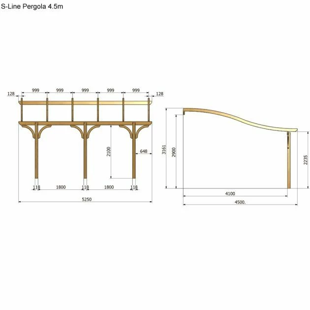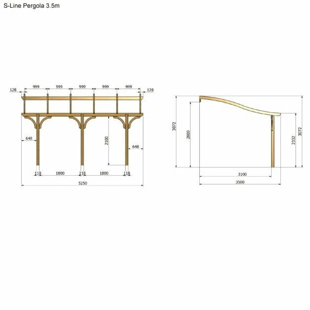Jagram S-Line Pergola 4.1m: The Jagram S-Line Pergola is an eye catching and elegant curved wooden pergola. The structure can be used to train climbing plants and create a secluded and shady garden space. With a width of 5.25m and a depth of 4.1m, the pergola can accommodate large furniture items beneath and can become a space for outdoor entertaining or peaceful relaxation. Expertly crafted from responsibly sourced and high quality Northern European Redwood, the S-Line Pergola features attractive curved and chamfered timber components with curved supports beneath the overhead beams.