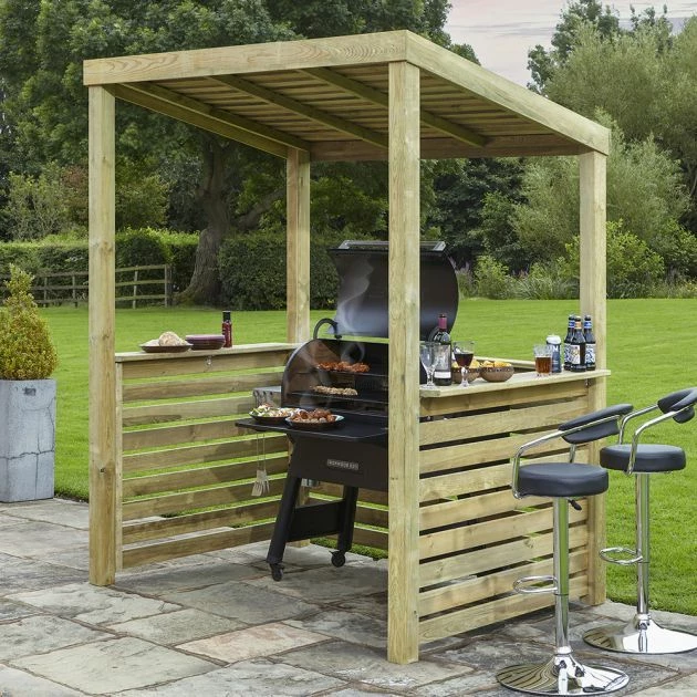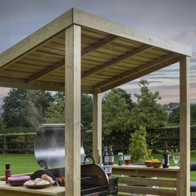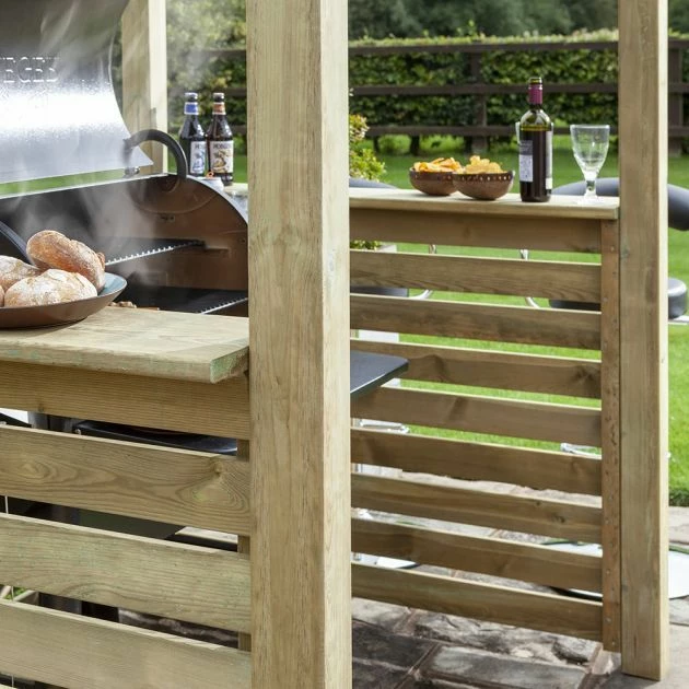 The Rowlinson Bondi Barbecue Shelter is the perfect choice to add a stylish and practical addition to your garden. The contemporary half-height paneling, topped with useful shelves and topped by a pent roof will provide you with shelter and shade when cooking up delicious meals on your barbecue. Measuring 1700mm wide, this shelter fits most barbecues, whilst being pressure treated against rot for longevity which allows you to enjoy entertaining friends and family repeatedly.